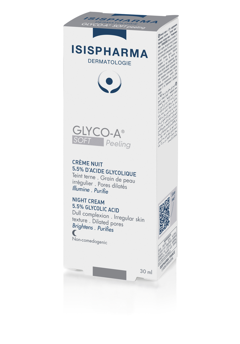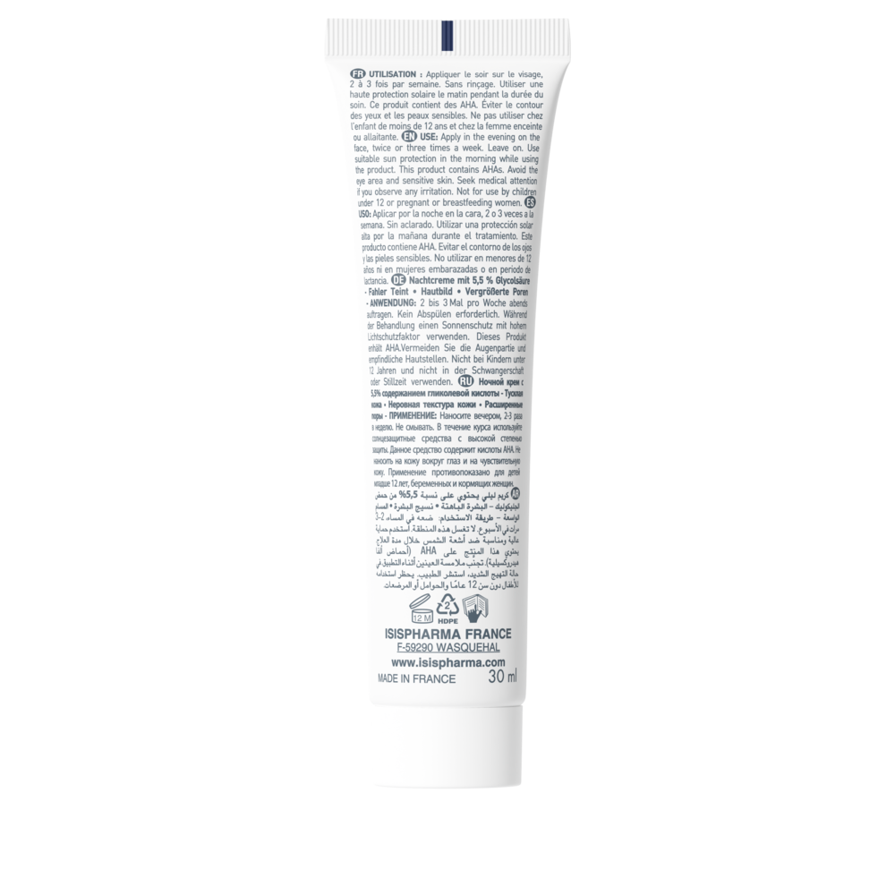 Cremă de noapte cu 5.5% acid glicolic, este indicată pentru un peeling superficial cosmetic în caz de pori dilatați, ten tern, imperfecțiuni ușoare.