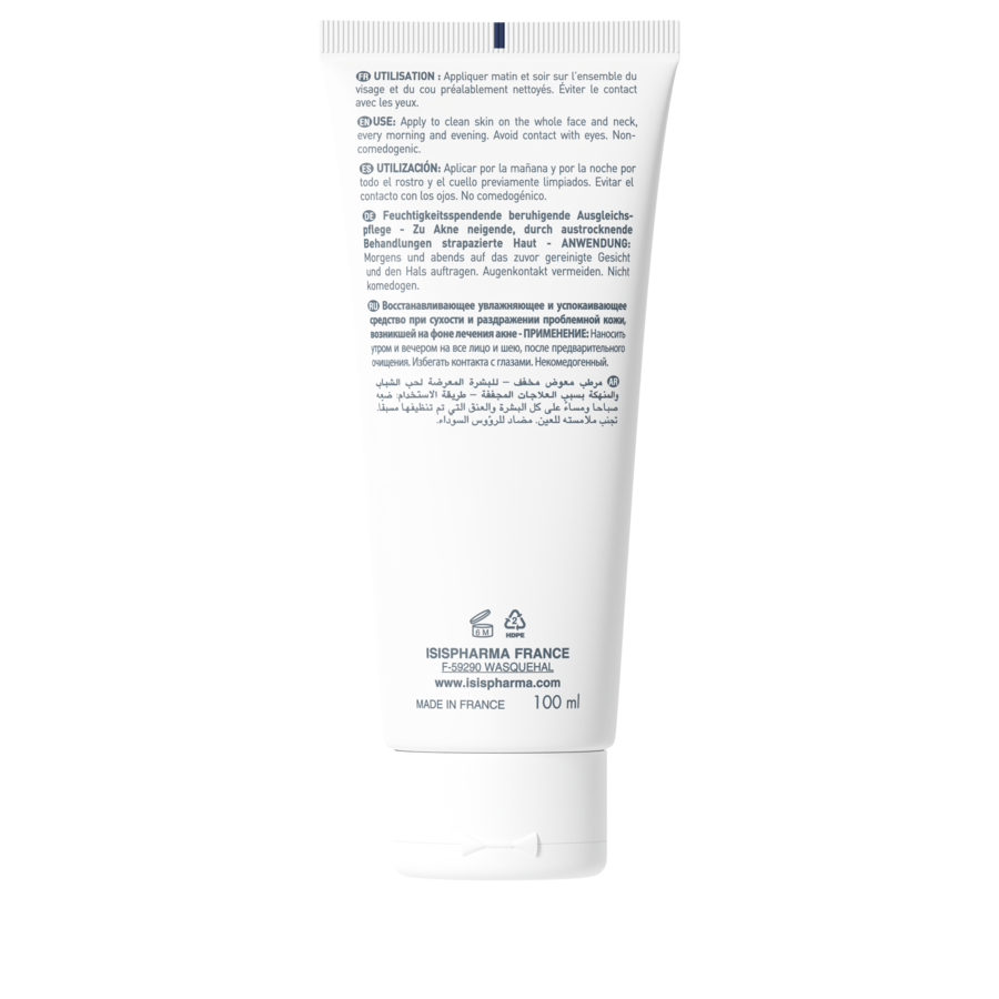 Cremă anti-acneică hidratantă. Piele cu tendință la acnee, fragilă și uscată. Reechilibrează și îmbunătățește hidratarea pielii slăbite de tratamentele anti-imperfecțiuni
