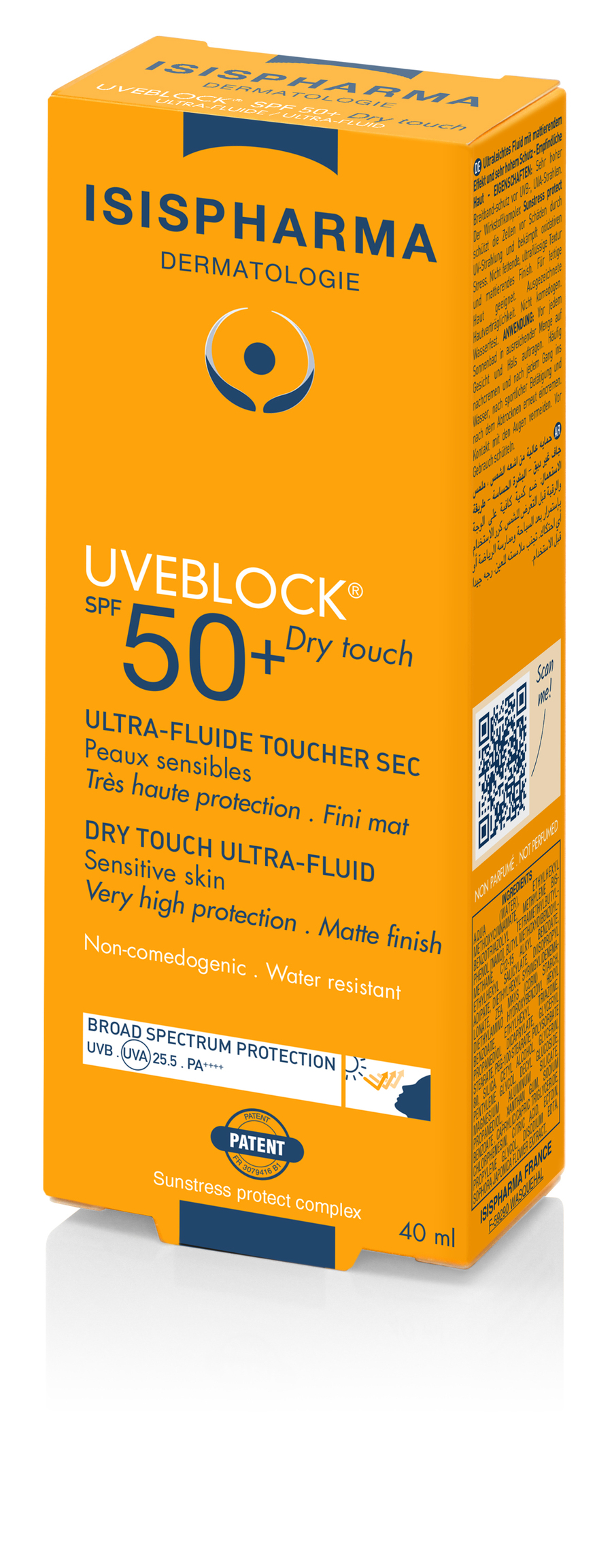 Fluid protector cu efect matifiant cu protectie solara SPF50+, ten gras. UVEBLOCK® SPF 50+ Dry Touch ofera o protectie optima SPF 50+ UVB/UVA si mentine pielea hidratata pe perioada expunerii la soare. Textura non-grasa, se absoarbe rapid. Nu lasa urme albe dupa aplicare. Efect matifiant. Fara silicon.